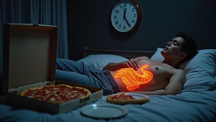 Dein Körper liegt da, verarbeitet die Lasagne, produziert Magensäure, arbeitet auf Hochtouren – während du verzweifelt versuchst zu schlafen.